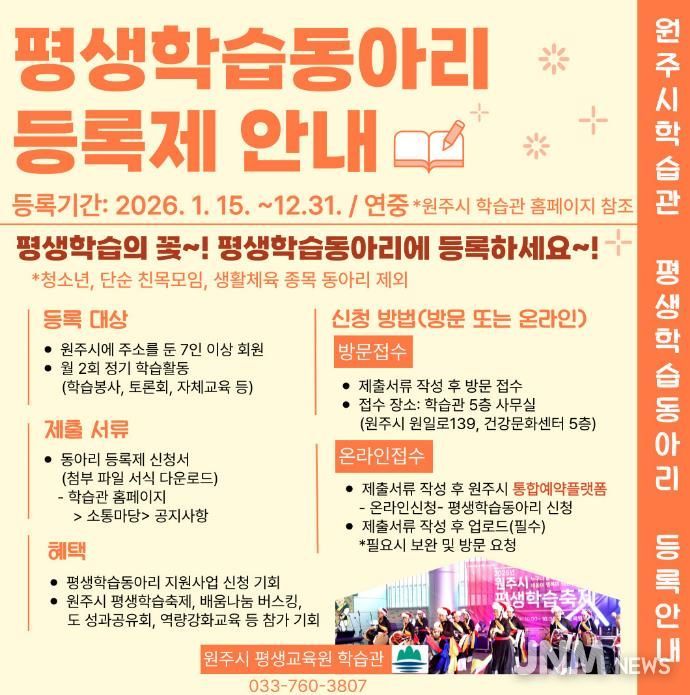 제이앤엠뉴스 | 원주시 평생교육원 학습관은 관내에서 활동하고 있는 잠재적 평생학습동아리를 발굴하기 위해 ‘평생학습동아리 등록제’를 운영하고 있다.