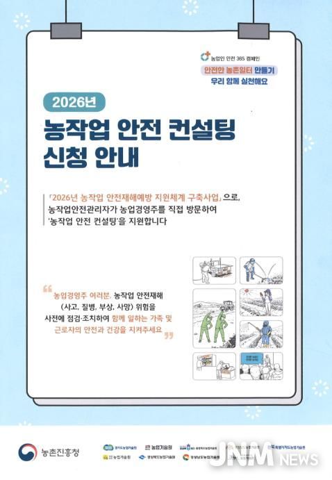 제이앤엠뉴스 | 안동시는 농업 분야 중대재해 예방과 안전한 농작업 환경 조성을 위해 '2026년 농작업 안전재해예방 지원체계 구축사업'의 일환으로 ‘농작업 안전보건관리 컨설팅’ 참여농가를 모집한다고 1월 16일(금) 밝혔다.