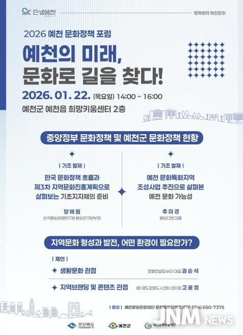 제이앤엠뉴스 | 예천군과 (재)예천문화관광재단은 지역 문화 정책 이해를 돕고 기관 간 연계 협력을 위해 22일 ‘예천 문화정책 포럼’을 시작으로 ‘공간·관계·돌봄’이라는 의제로 거버넌스 포럼을 연속해 개최한다.