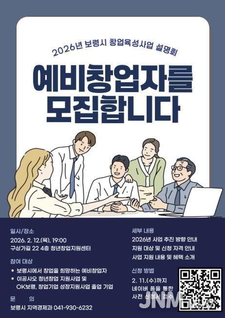 제이앤엠뉴스 | 보령시는 오는 2월 12일 오후 7시 청년창업지원센터에서 예비창업자 및 창업기업을 대상으로 ‘2026년 창업육성사업 설명회’를 개최한다.