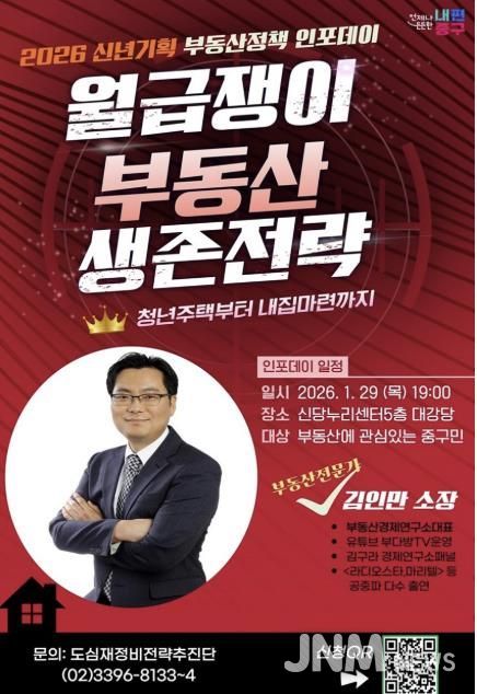 제이앤엠뉴스 | 서울 중구가 급변하는 부동산 환경 속에서 주민들의 현실적인 대응 전략을 돕기 위해 오는 29일 저녁 7시 신당누리센터 5층 대강당에서 올해 첫 도시런(learn) 스쿨‘신년기획 부동산 전략 인포(INFO)데이’를 연다.