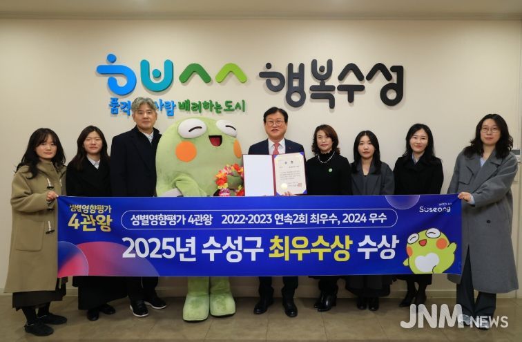 제이앤엠뉴스 | 대구 수성구는 대구광역시가 9개 구·군을 대상으로 실시한 ‘2025년 성별영향평가 구·군 수행평가’에서 최우수상을 수상했다고 밝혔다. 이로써 수성구는 2022·2023년 최우수상, 2024년 우수상에 이어 4년 연속 우수기관으로 선정되는 성과를 거뒀다.