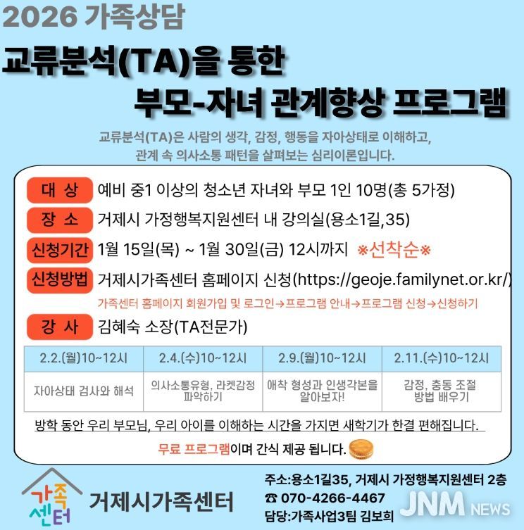 제이앤엠뉴스 | 거제시가족센터는 오는 2일부터 진행하는'교류분석(TA)을 통한 부모–자녀 집단상담 프로그램' 참여자를 모집한다고 밝혔다.