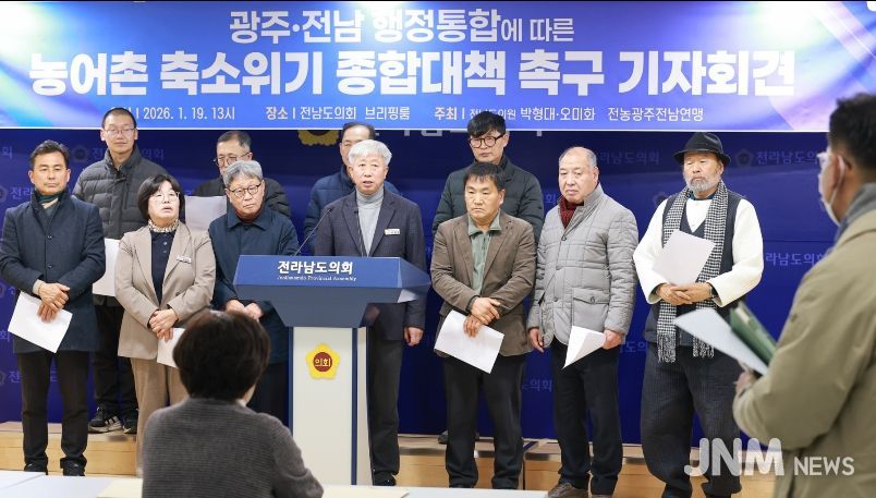 제이앤엠뉴스 | 전라남도의회 박형대 의원(진보당·장흥1)은 1월 19일 도의회 브리핑룸에서 기자회견을 열고 “광주ㆍ전남 행정통합 논의가 속도를 내고 있지만 농어촌 축소 위기에 대한 대비는 현저히 부족하다”며 농어촌 보호를 위한 구체적 합의를 요구했다.