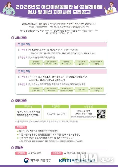 제이앤엠뉴스 | 기후에너지환경부와 한국환경산업기술원은 어린이 활동공간에 새롭게 적용되는 환경안전관리기준에 따라 ‘납’과 ‘프탈레이트’에 대한 검사를 지원하고, 기준을 초과한 시설에 대해서는 개선 지원을 추진한다고 밝혔다.