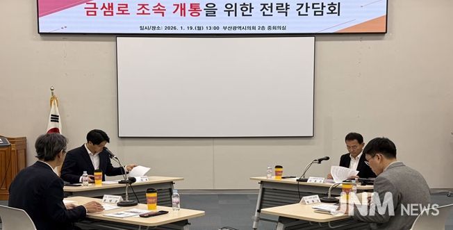 제이앤엠뉴스 | 부산광역시의회 이준호.이종진 의원은 1월 19일 오후 1시, 시의회 중회의실에서 '금샘로 조속 개통을 위한 전략 간담회'를 개최했다. 이번 간담회는 산성터널 접속도로 미개설 구간인 금샘로 공사의 지연 원인을 점검하고, 조속한 사업 추진을 위한 실질적인 해결 방안을 모색하기 위해 마련됐다.