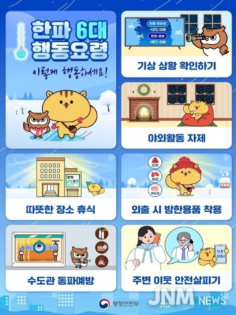제이앤엠뉴스 | 행정안전부는 1월 20일부터 25일까지 전국 대부분 지역에 한파가 이어질 것으로 전망됨에 따라 김광용 재난안전관리본부장 주재로 관계기관 대책회의를 개최하고, 오늘(19일) 17시부로 한파 재난 위기경보 수준을 ‘관심’에서 ‘주의’ 단계로 격상한다고 밝혔다.