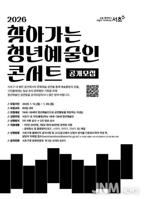 제이앤엠뉴스 | 서울 서초구는 지역 내 일상 공간에서 자유롭게 끼와 역량을 펼칠 청년예술인 모집에 나선다고 밝혔다. 모집사업은 ‘찾아가는 청년예술인 콘서트’와 ‘서초 청년갤러리 사업’으로 각각 1월 26일(월), 2월 19일(목)까지 신청을 받는다.
