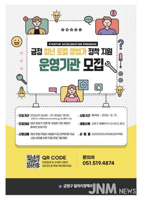 제이앤엠뉴스 | 부산 금정구는 지역에 정착할 수 있는 청년 로컬 창업가를 육성하기 위해 ‘금정 청년 로컬 창업가 정착 지원’ 사업을 추진하고, 이를 운영할 운영기관(보조사업자)을 공개 모집한다고 밝혔다.