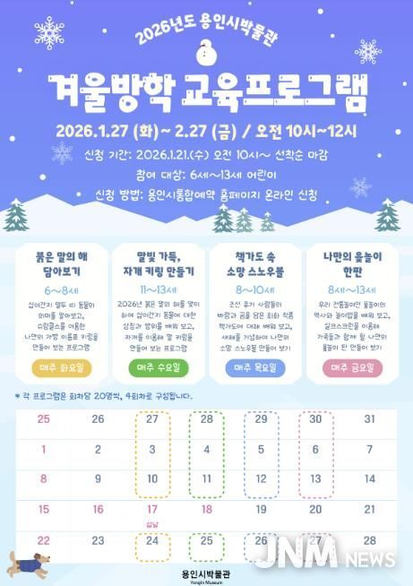 제이앤엠뉴스 | 용인시박물관은 어린이들이 역사와 전통문화를 쉽고 재미있게 체험할 수 있는 ‘2026년 겨울방학 교육 프로그램’을 운영한다고 20일 밝혔다.