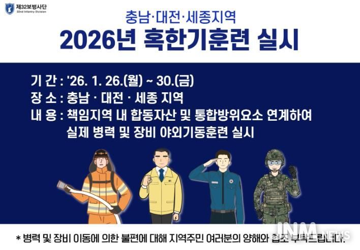 제이앤엠뉴스 | 육군 제32보병사단은 오는 1월 26일부터 30일까지 충남ㆍ대전ㆍ세종 지역에서 동계 통합 방위 작전 확립을 위한 혹한기 훈련을 진행한다.