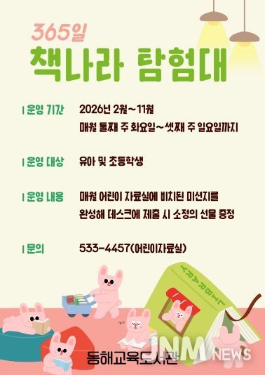 제이앤엠뉴스 | 동해교육도서관(관장 안은희)은 어린이들의 독서 흥미를 높이고 도서관 방문을 활성화하기 위해 어린이 독서활동 프로그램 ‘365일 책나라 탐험대’를 운영한다고 밝혔다.
