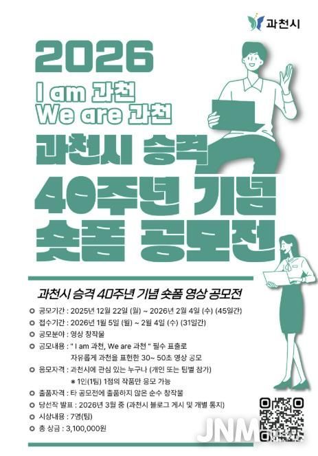 제이앤엠뉴스 | 과천시는 시 승격 40주년을 맞아 ‘숏폼 영상 공모전’을 개최하고, 오는 2월 4일까지 작품을 모집한다고 밝혔다.