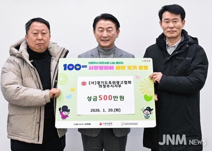 제이앤엠뉴스 | 의정부시는 1월 20일 (사)경기도옥외광고협회 의정부시지부가 ‘100일간 사랑릴레이 배턴 잇기’에 동참해 성금 500만 원을 기탁했다고 밝혔다.