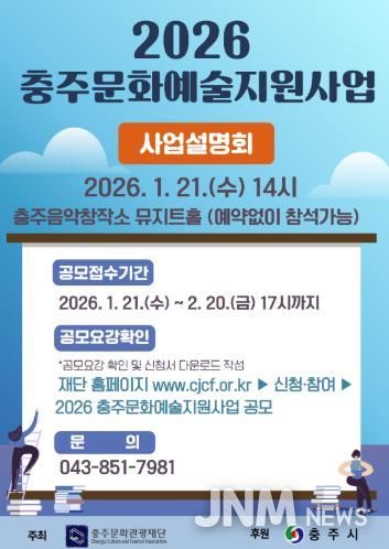 제이앤엠뉴스 | (재)충주문화관광재단은 충주시 예술인 및 예술단체의 창작활동 기반을 마련하여 문화예술 생태계를 조성하고자 1월 19일부터‘2026 충주문화예술지원사업’공모를 진행하고 있다고 밝혔다.