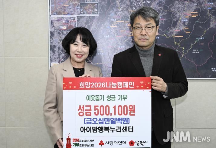 제이앤엠뉴스 | 남원시는 지난 20일, 아이맘행복누리센터가 ‘희망 2026 나눔 캠페인’에 성금 50여만 원을 기부했다고 밝혔다.