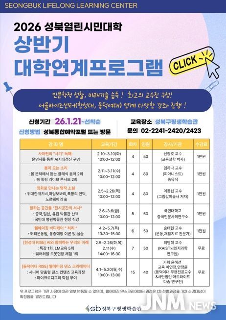 제이앤엠뉴스 | 서울 성북구가 2월부터 5월까지 구민을 대상으로 ‘2026 상반기 열린시민대학’을 운영한다.