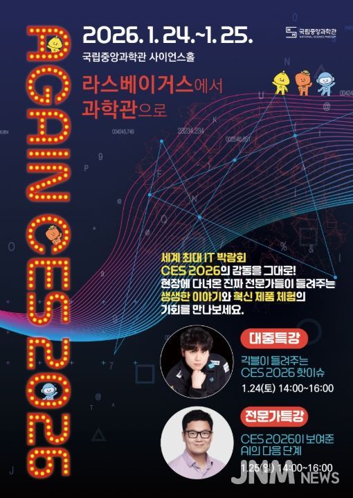 제이앤엠뉴스 | 미래의 꿈을 만드는 과학기술 문화 이음터(플랫폼) 과학기술정보통신부 국립중앙과학관은 1월 24일부터 1월 25일까지 이틀간 국립중앙과학관 사이언스 홀에서 세계 최대 정보 기술(IT) 박람회인 2026 미국 가전 전시회(CES 2026)를 되짚어 보는 행사를 개최한다.