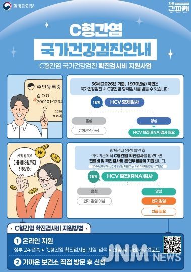 제이앤엠뉴스 | 거제시보건소는 2026년 기준 만 56세(1970년생) 시민 중 국가건강검진에서 C형간염 항체검사 결과가 ‘양성’으로 나온 경우, 추가로 필요한 확진검사 비용을 최대 7만 원까지 지원한다고 밝혔다.