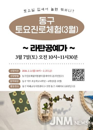 제이앤엠뉴스 | 인천 동구는 관내 초등학생 4학년~6학년을 대상으로‘동구 토요진로체험’프로그램을 운영한다고 밝혔다.