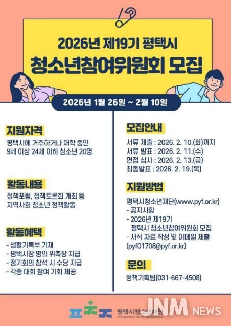 제이앤엠뉴스 | 평택시와 평택시청소년재단은 청소년 정책 참여 기회를 확대하고 자치 역량을 강화하기 위한 2026년 제19기 청소년참여위원회 위원 20명을 공개 모집한다고 밝혔다.