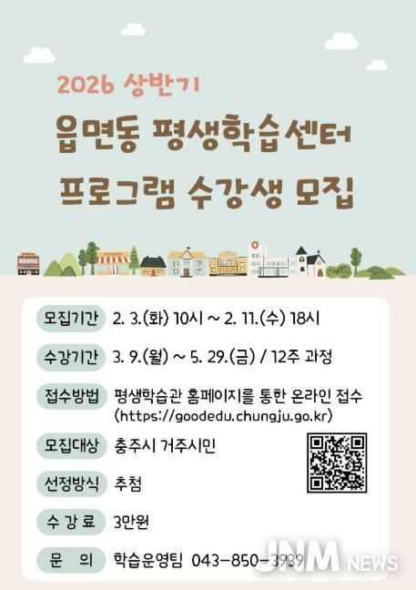 제이앤엠뉴스 | 충주시 평생학습관은 시민 누구나 거주지 인근에서 배움의 기회를 누릴 수 있도록 2026년 상반기 읍면동 평생학습센터 프로그램 수강생을 모집한다고 30일 밝혔다.