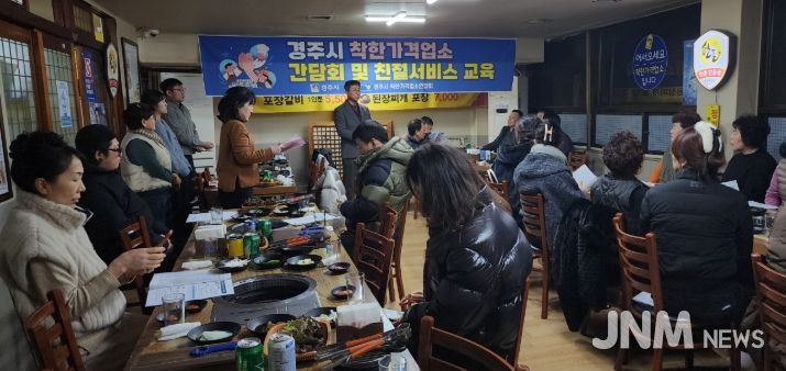 제이앤엠뉴스 | 경주시는 지난 28일, 관내 착한가격업소 업주 40여 명이 참석한 가운데 ‘경주시 착한가격업소연합회 간담회 및 친절서비스 교육’을 열고, 업소 경쟁력 강화와 서비스 품질 향상에 나섰다.