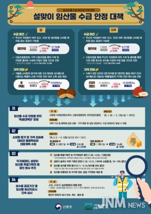 제이앤엠뉴스 | 산림청은 설 명절을 대비해 대표 임산물인 밤과 대추의 공급에 차질이 없도록 설 연휴 전날인 2월 13일까지 ‘설 성수품(임산물) 수급 안정 대책반’을 운영한다고 29일 밝혔다.