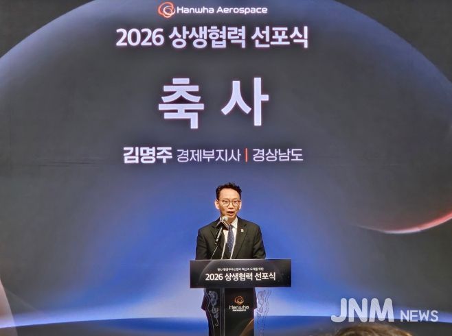 제이앤엠뉴스 | 경상남도는 3일 오후 한화에어로스페이스 창원3사업장 R&D센터에서 열린 ‘한화에어로스페이스 2026 상생협력 선포식’에 참석해 방위산업 분야 대·중소기업 상생협력 확산을 위한 민·관 협력 의지를 재확인했다.