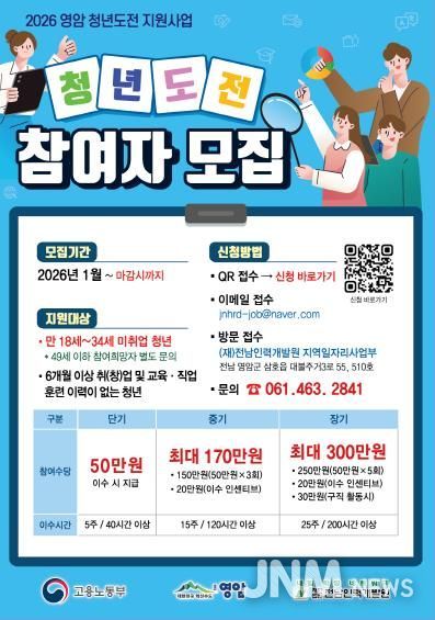 제이앤엠뉴스 | 영암군이 (재)전남인력개발원과 ‘2026년 영암군 청년 도전 지원사업’ 참여자를 모집 중이다.