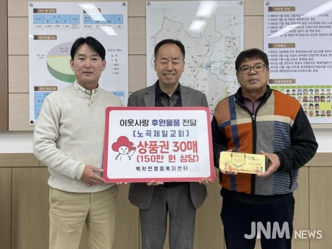 제이앤엠뉴스 | 연천군 백학면 노곡제일교회는 지난 4일 백학면행정복지센터를 방문해 설 명절을 맞아 소외계층에게 전달해달라며 농촌사랑상품권 150만 원을 기탁했다.