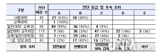 이번 진단 결과에 따라 해당 기관의 2027학년도 교원양성정원이 조정된다. 진단 결과 씨(C) 등급 기관은 정원의 30% 감축, 디(D) 등급 기관은 정원의 50%가 감축되며, 이(E) 등급 기관은 교원양성기능이 폐지될 예정이다.