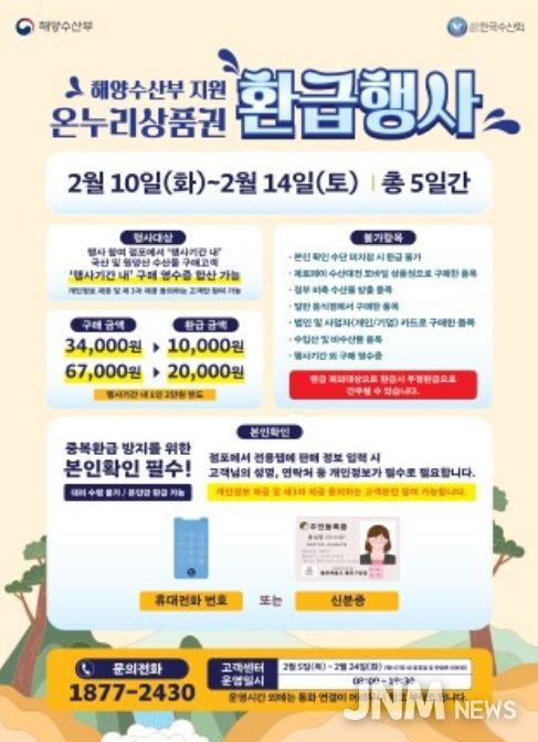 제이앤엠뉴스 | 경상남도는 설 명절을 맞아 국내산 수산물 소비 촉진과 전통시장 활성화를 위해 2월 10일부터 14일까지 도내 20개 전통시장에서 ‘온누리상품권 환급행사’를 추진한다고 밝혔다.