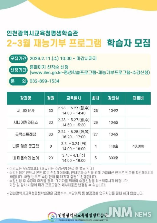제이앤엠뉴스 | 인천광역시교육청평생학습관은 오는 23일부터 ‘재능기부 프로그램’을 운영한다.