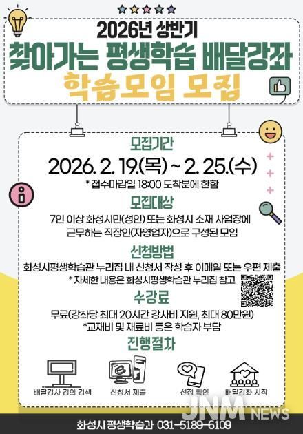 제이앤엠뉴스 | 화성특례시는 2월 19일부터 2월 25일까지 2026년 상반기'찾아가는 평생학습 배달강좌'학습모임을 모집한다.