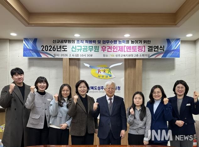 제이앤엠뉴스 | 경상북도성주교육지원청은 6일 소회의실에서 2026. 1. 1.자 신규 공무원 1명, 멘토 공무원 2명이 참석하여 신규 공무원의 조직 적응력을 높이고 자신감 있는 공직 생활을 유도하고자 후견인제(멘토링) 결연식과 직무연수를 가졌다.