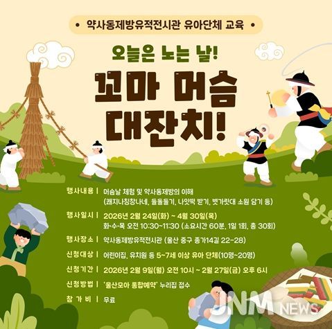 제이앤엠뉴스 | 울산 약사동제방유적전시관이 관내 어린이집과 유치원 원아(5세~7세)를 대상으로 머슴날(음력 2월 1일)과 관련한 교육 프로그램 ‘오늘은 노는 날! 꼬마 머슴 대잔치!’를 운영한다.