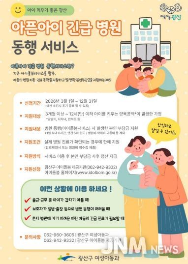 제이앤엠뉴스 | 광주 광산구가 3월 1일부터 부모가 곁에 없거나 돌봐주기 어려운 상황에서 갑작스럽게 진료가 필요한 아동을 위한 ‘아픈 아이 긴급 병원 동행’ 서비스를 시행한다.