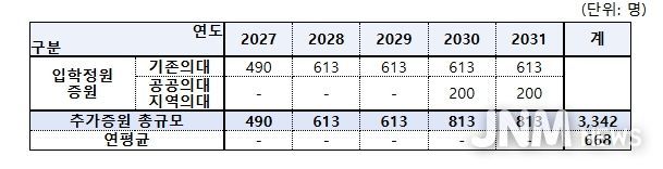 제이앤엠뉴스 | 보건복지부는 2월 10일 오후 2시, 정부서울청사(서울 종로구 소재)에서 제7차'보건의료정책심의위원회'(이하 보정심)를 개최하여 지역․필수․공공의료 강화를 위해 서울을 제외한 32개 의과대학을 대상으로 2027년부터 2031년까지 의사인력 양성 규모를 연평균 668명 늘리기로 결정했다. 기존 의대 증원 인원 중 2024학년도 정원(3,058명)을 초과하는 부분은 모두 지역의사로 선발된다. 또한 증원 초기 의학교육 현장의 부담을 완화하기 위하여 단계적으로 증원을 추진한다.