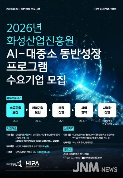 제이앤엠뉴스 | 화성산업진흥원은 AI 기술 사업화 협력을 통해 산업 전반의 경쟁력을 높이기 위해 오는 2월 25일까지 ‘2026년 AI-대중소 동반성장 프로그램’ 수요기업을 모집한다고 밝혔다.