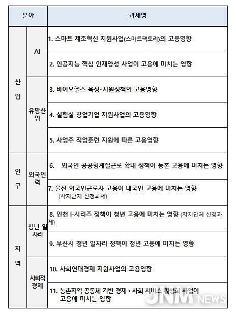 이날 회의에서는 2026년도 평가대상 후보과제에 대해서도 심의가 이뤄졌는데, 그간 고용 및 산업 전문가, 관계부처, 자치단체 등의 의견수렴 등을 거쳐 11개 후보과제가 발굴되었고, AI 등 유망산업분야(5개), 외국인 고용 등 인구구조분야(2개), 청년일자리・사회적 경제 등 지역정책분야(4개) 등 일자리에 영향을 미치는 주요 정책과제들로 확정되었다.