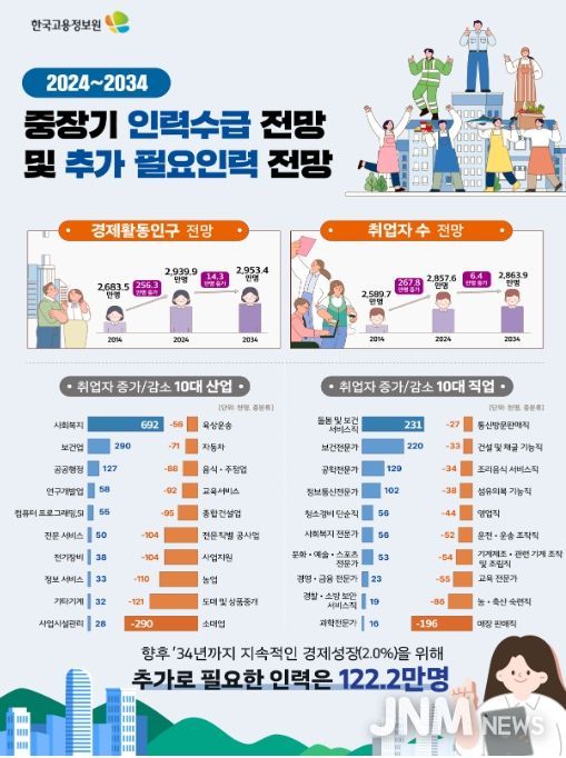 제이앤엠뉴스 | 한국고용정보원(원장 이창수)은 '중장기 인력수급 전망'을 통해 향후 10년간 우리나라 노동시장의 인력공급(경제활동인구)과 인력수요(취업자)가 구조적으로 전환되는 양상을 전망하고, 향후 지속적인 성장을 위해 추가로 필요한 인력을 추계했다.