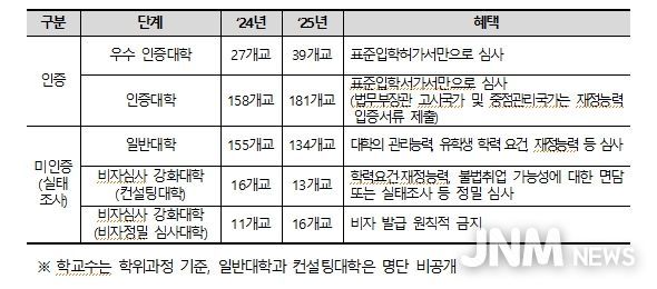 한편, 인증대학 외에 외국인 유학생이 1명 이상 재적 중인 대학에 대해서는 ‘유학생 유치‧관리 실태조사’를 실시하고, 일정 기준을 충족하지 못할 시 비자심사 강화대학(컨설팅대학, 비자정밀 심사대학)으로 지정했다. 이를 통해 대학이 외국인 유학생의 유치 단계에서 어학 능력과 재정 능력 등을 엄격히 심사하도록 하고, 유학생 관리 전반에 대한 대학의 책임을 강화할 예정이다.