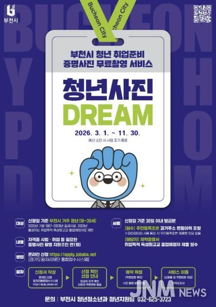 제이앤엠뉴스 | 부천시는 청년의 구직활동과 사회진출을 지원하기 위해 자격증 취득과 취업 준비 과정에서 필요한 증명사진 촬영을 지원하는 ‘부천 청년 사진 드림(Dream) 사업’을 추진한다고 13일 밝혔다.