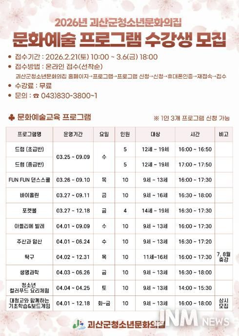 제이앤엠뉴스 | 충북 괴산군청소년문화의집이 청소년들의 창의적 역량과 전인적 성장을 지원하기 위한 ‘2026년 문화예술 프로그램’ 수강생을 모집한다고 20일 밝혔다.