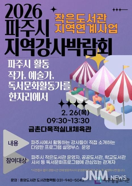 제이앤엠뉴스 | 파주시 중앙도서관은 오는 26일 9시부터 금촌다목적실내체육관에서 녪파주시지역강사박람회’를 개최한다.