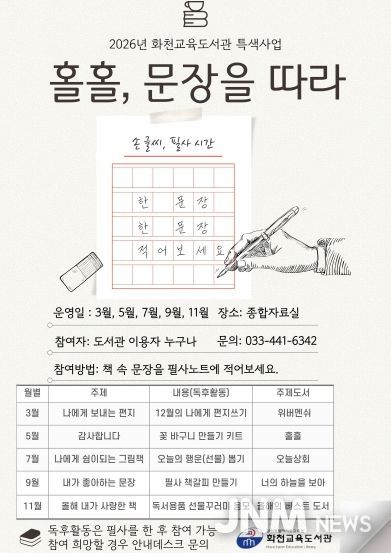 제이앤엠뉴스 | 화천교육도서관은 오는 3월부터 11월까지 깊이 있는 독서문화의 확산을 위해 2026년 특색사업 ‘홀홀, 문장을 따라’를 운영한다.