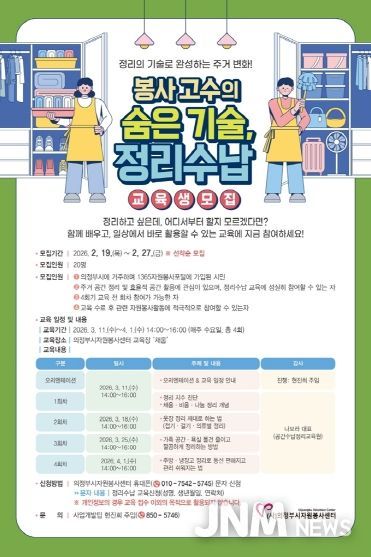 제이앤엠뉴스 | 의정부시자원봉사센터는 시민들의 주거환경 개선 역량 강화를 위해'봉사고수의 숨은 기술, 정리수납 교육'을 오는 3월 11일부터 4월 1일까지 매주 수요일 오후 2시부터 4시까지 총 4회에 걸쳐 진행하며, 이에 따른 참여자를 오는 2월 27일까지 모집한다.