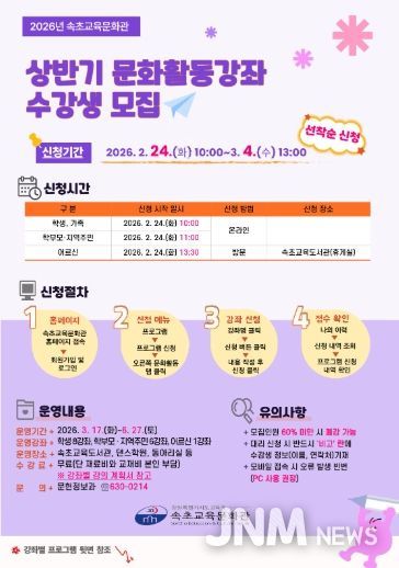 제이앤엠뉴스 | 속초교육문화관은 3월부터 6월까지 지역 주민의 다양한 학습 수용에 부응하고 배움과 자기계발의 기회를 제공하기 위해 ‘2026년 상반기 문화활동강좌’를 운영한다.