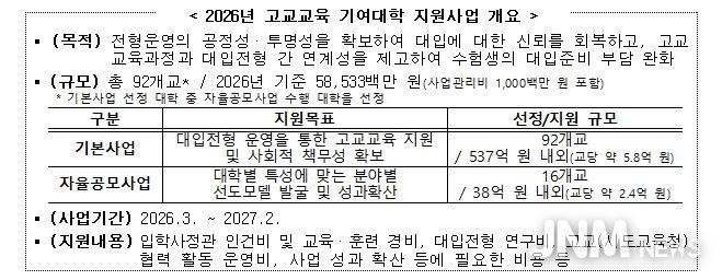 제이앤엠뉴스 | 교육부은 2월 24일, ‘2026년 고교교육 기여대학 지원사업 기본계획’을 발표한다.